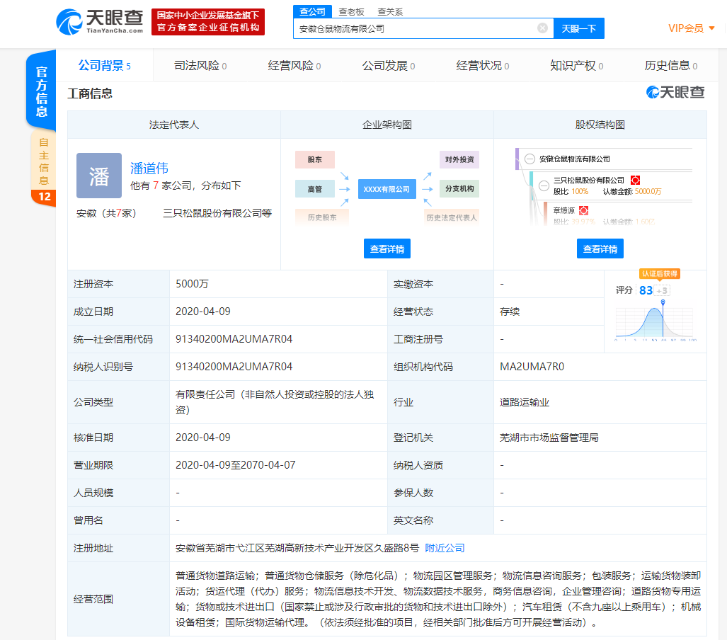 龙商网消息:天眼查数据显示,三只松鼠股份有限公司4月9日在芜湖成立安徽仓鼠物流有限公司。安徽仓鼠物流有限公司则注册资本5000万,公司经营范围包括普通货物道路运输;普通货物仓储服务(除危化品);物流园区管理服务;物流信息咨询服务;包装服务;运输货物装卸活动;货运代理(代办)服务;物流信息技术开发、物流数据技术服务等。天眼查股东信息显示,该公司为三只松鼠股份有限公司100%持股。