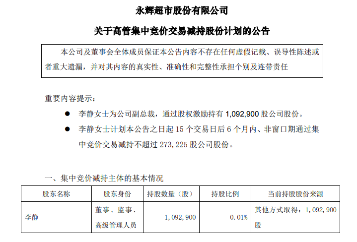 龙商网消息:永辉超市公告称,高管李静拟减持不超过273225股,占公司总股本的0.003%。