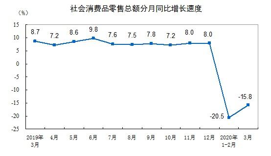 龙商网消息:据国家统计局17日数据,3月份,社会消费品零售总额26450亿元,同比下降15.8%(扣除价格因素实际下降18.1%,以下除特殊说明外均为名义增长),降幅比1—2月份收窄4.7个百分点。其中,除汽车以外的消费品零售额23841亿元,下降15.6%。