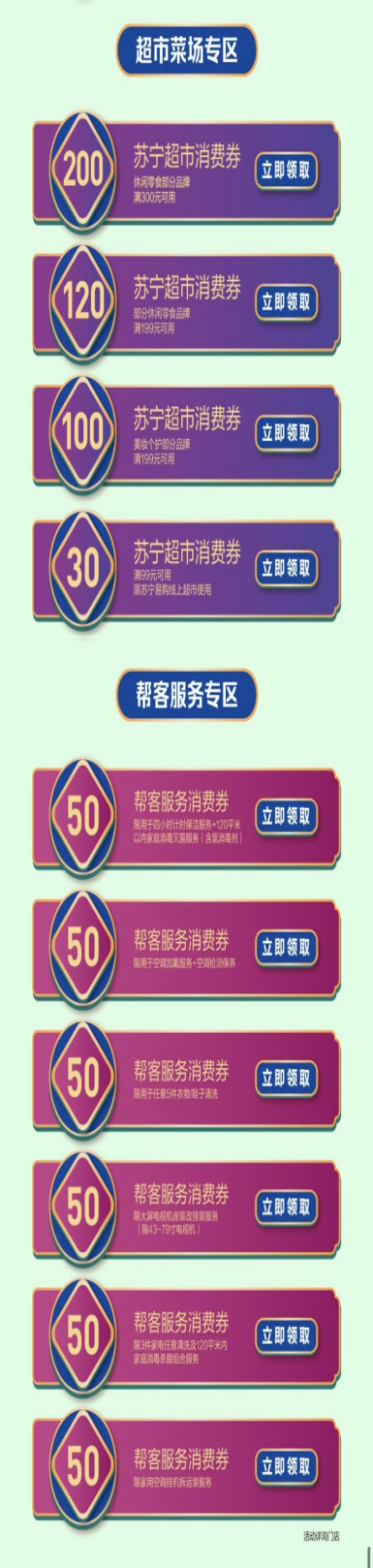 并且,该消费券在上海地区苏宁易购线下门店、苏宁红孩子、苏宁极物、苏宁帮客、苏宁百货以及苏宁线上超市都可以使用。