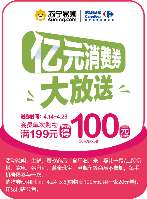家乐福1亿元消费券同样以电子券发放,4月14日至23日期间,市民在家乐福门店购物满199元可返100元消费券(20元*5张),在4月24日至5月6日期间可使用。