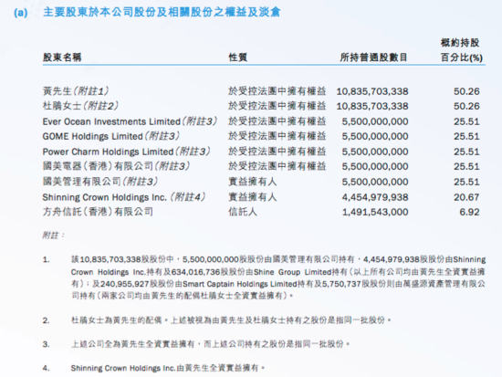从以上财报截图中可以看到,公司前八大股东中,除了明确写出的前两大股东黄光裕和杜鹃,从第三到第八的实际控制人依然是黄氏夫妇。