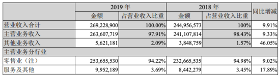 在收入构成上,零售业务、服务及其他业务是苏宁易购的主营业务,其中零售业务收入为2536.6亿元,同比增长9.02%,占了总营收的九成以上。