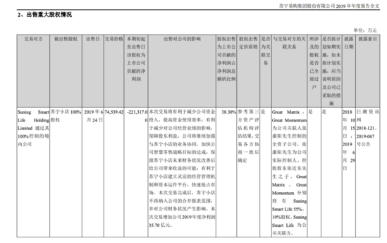 2019年6月末,苏宁易购完成对苏宁小店的股权转让,此次交易增加公司年度净利润35.7亿元;9月,苏宁金服完成了C轮增资扩股,此次交易增加公司净利润98.57亿元。