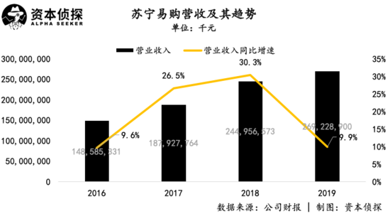 在营收趋势上,苏宁易购仍处于增长轨道中,但2019年的增速相比2018年的30.3%大幅下降,是近年来首次出现增速放缓趋势。