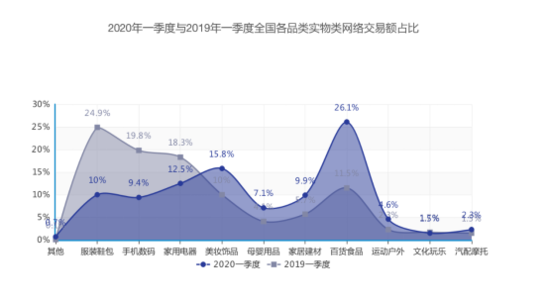 受疫情影响,今年一季度实物类网络零售品类发生巨大变化,消费类目由长期以来的占据主导地位的服装鞋包、手机数码、家用电器等向百货食品、家居用品等类目大规模倾斜和转移。服装鞋包、手机数码、家用电器三大网络零售品类交易受到较大影响。