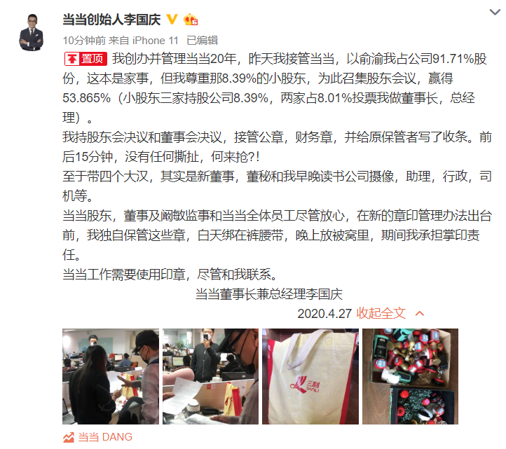 4月27日,李国庆对接管印章过程在微博发文称,“我持股东会决议和董事会决议,接管公章,财务章,并给原保管者写了收条。前后15分钟,没有任何撕扯,何来抢?!”李国庆称,“当当股东,董事及阚敏监事和当当全体员工尽管放心,在新的章印管理办法出台前,我独自保管这些章,白天绑在裤腰带,晚上放被窝里,期间我承担掌印责任。当当工作需要使用印章,尽管和我联系。”