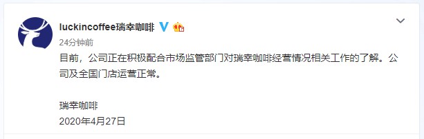 4月27日消息,针对网传瑞幸咖啡被公安、工商部门接管以及证监会进驻一事,瑞幸咖啡发布声明称,目前,公司正在积极配合市场监管部门对瑞幸咖啡经营情况相关工作的了解。公司及全国门店运营正常。