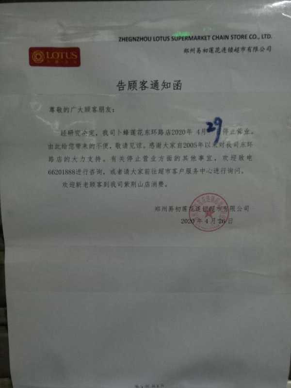位于农业路的卜蜂莲花门店在郑州经营了15年左右,超市方面称,闭店时间尚未确定。但4月29日,员工们按要求前来上班时,却发现超市大门紧锁,并贴着通知:正式闭店。