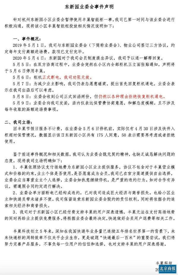 丰巢涨价后,遭到杭州某小区对快递柜断电罢用,5月9日,丰巢发布声明表示,业委会严重的违约,将依据合约追索相关经济和商誉损失。 丰巢表示,依照协议支付场地费为东新园小区业主提供服务,协议不包含对于丰巢营业模式和价格的约束,业主个体是否使用,是否...