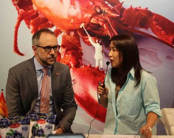 5月12日,加拿大驻沪副总领事贝杰思(JC Brillant)走进家乐福上海古北店直播间,以主播的身份,向市民热情推介加拿大“国宝级”龙虾,并连线当地渔民,现场直播出海捕捞的情况,当中还穿插不少加拿大龙虾的趣闻。
