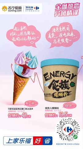 同时,家乐福还为大家带来美食界的超级“CP杠把子”,包括可爱多超级棉花糖口味冰淇淋与食族人螺蛳粉的全城热恋异域情缘搭配、雀巢咖啡冷萃风味无糖浓咖啡饮料与缤纷提拉米苏杯的全城热恋欢喜冤家搭配、闪电泡芙礼盒与百威啤酒的全城热恋浪漫情侣搭配、洽洽香瓜子与RIO白桃味鸡尾酒的全城热恋甜心宝贝搭配等……