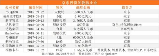除了依靠自身力量组建京东物流之外,京东也通过投融资、并购等方式巩固物流城池。IT桔子数据显示,截止2020年 5月 14日,仅公开事件中,京东共计参与10起物流领域的投融资、并购。