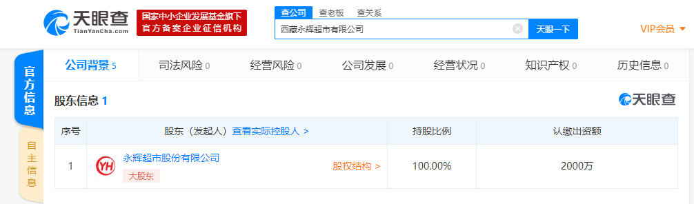 天眼查数据显示,5月29日,西藏永辉超市有限公司成立,注册资本2000万,法定代表人为李盛文,公司经营范围包括预包装食品、散装食品、乳制品(含婴幼儿配方奶粉)、电脑及耗材、二类医疗器械销售等。该公司由永辉超市股份有限公司全资持股。