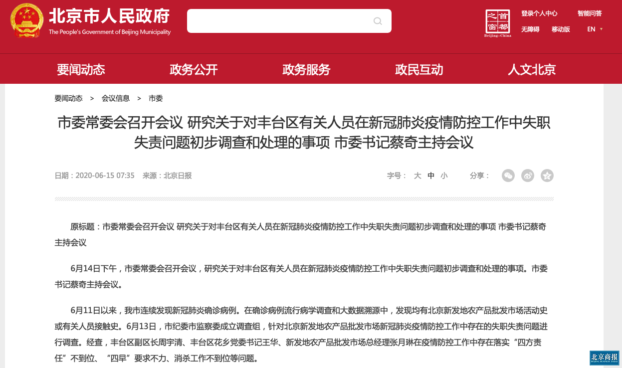 6月14日下午,北京市委常委会召开会议,研究关于对丰台区有关人员在新冠肺炎疫情防控工作中失职失责问题初步调查和处理的事项。市委书记蔡奇主持会议。 6月11日以来,我市连续发现新冠肺炎确诊病例。在确诊病例流行病学调查和大数据溯源中,发现均有北京新发...