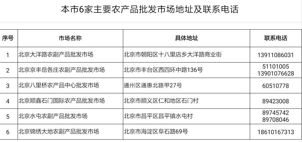 6月15日,北京市商务局官网发布“关于发布我市6家主要农产品批发市场信息的通知”,公布了北京市6家主要农产品批发市场地址与电话,有需要的单位可与6家批发市场开展对接与合作。