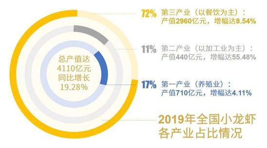 其中,第二产业占比增幅较大为55.48%,第三产业产值占总产值最大为72.02%。小龙虾产业已成为由消费主导的渔业融合型产业。