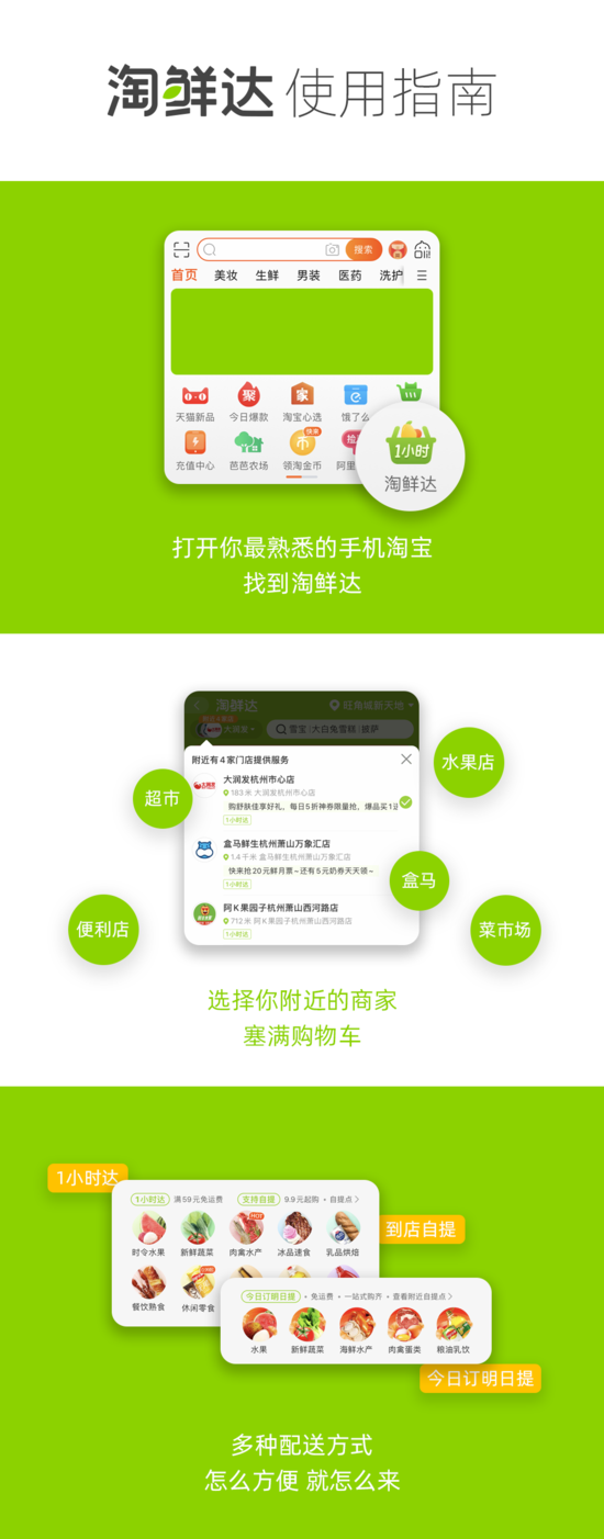 目前来看,淘鲜达到家服务已覆盖大卖场、区域商超生鲜小业态以及便利店三个主要场景,并分别给出差异化解决方案。例如其配送方式设计为到家、到店以及今日订明日提三种方式,在配送时间更是打破了原来小时达的单一方式,将其丰富为半日达、次日达等,使得商家、消费者应用场景更加多元,购物频次有所提升。