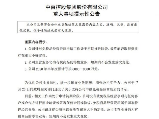 2目前,相关工作尚处于申请初期阶段,公司没有就免税品经营事项与任何客户或合作方进行商业洽谈或签署任何合同或协议。免税商品经营资质属于国家特许经营资质,公司最终能否获得该资质存在重大不确定性。公司主营业务仍为有税商品的零售业务,短期内不会发生重大变化。