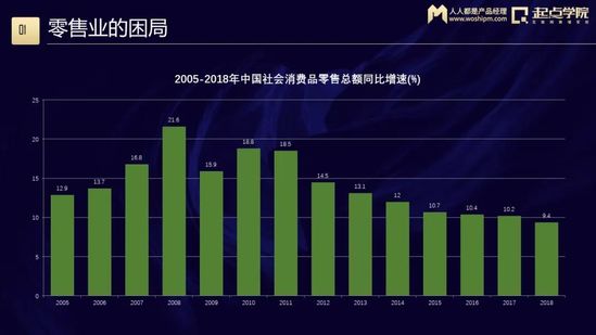 十年前,零售业有个网络化的概念,没火。这两年,新零售的概念火了,为什么呢? 今天我从四个方面来分享,零售业面临的一些困局、如何破局、大厂在新零售行业的布局是什么样的、中小型企业会有什么样的机遇? 01 零售业的困局 1. 增速在放缓 中国的社会品消...