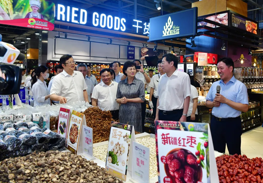 杜家毫书记一行走访到步步高智慧零售旗舰店时,看到水果区域正在举办的新疆瓜果节,他当即尝了一颗无核白葡萄:“这个葡萄多新鲜啊!”