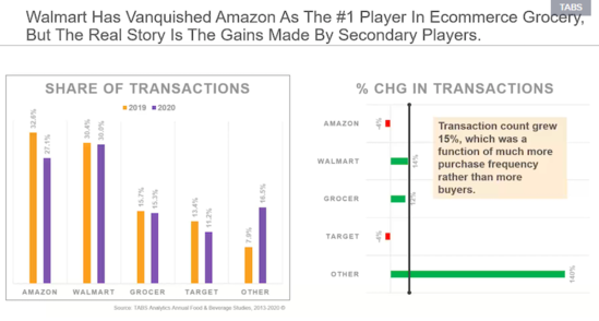 TABS公司表示,沃尔玛获得了30%的在线食品和饮料零售份额,较2019年的30.4%略有下降。亚马逊的在线杂货交易额下降了5个百分点,从32.6%降至27.1%。