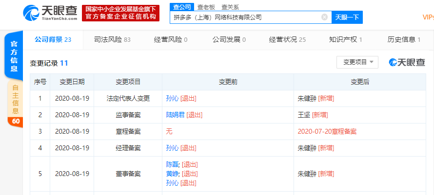 天眼查App显示,近日,拼多多(上海)网络科技有限公司发生多项工商变更,拼多多联合创始人孙沁退出该公司法定代表人、董事及经理,均由拼多多高级副总裁朱健翀接任;与此同时,拼多多创始人黄峥、拼多多CEO陈磊退出公司董事,新增朱健翀为董事。此外,陆娟君退出监事行列,新增王坚为监事。