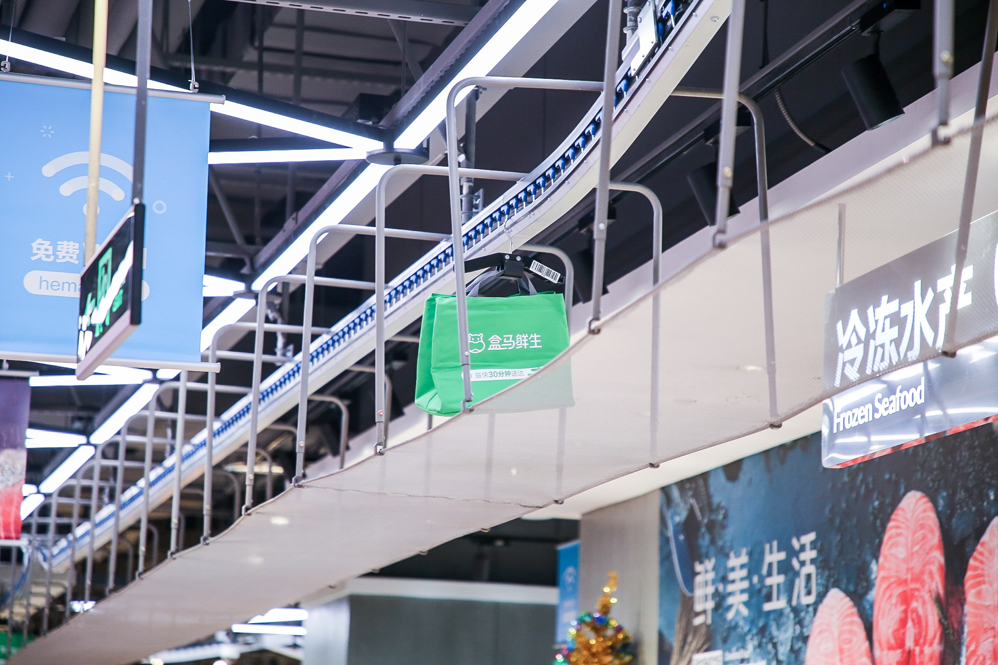 盒马首创的悬挂链系统,曾参加乌镇互联网大会、美国NRF等科技展。自2016年金桥店开业以来,德国、意大利、日本、韩国等国家的科技公司和零售企业也多次前来盒马参观考察,试图探寻“新零售第一店”成功的秘密武器。