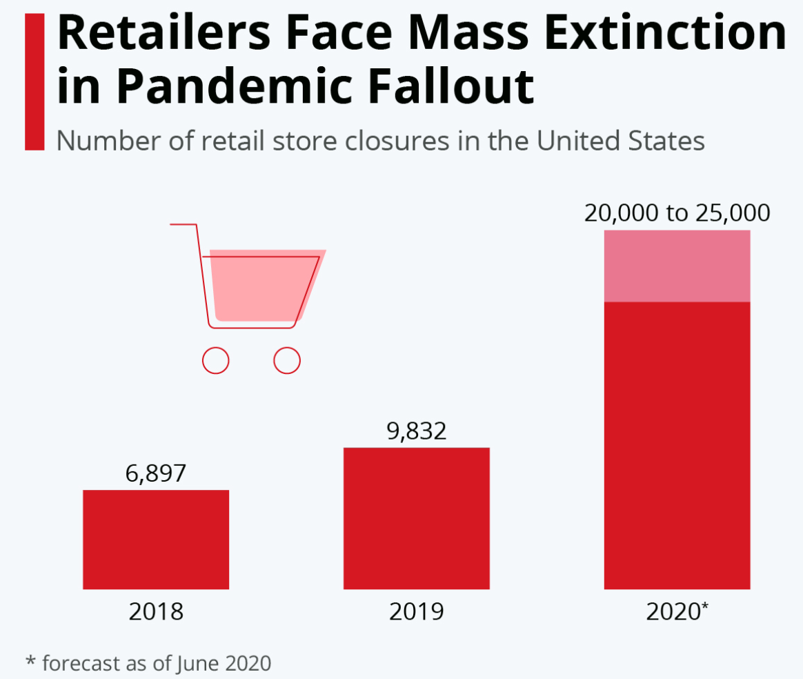 Coresight Research称,受新冠疫情影响以及消费者加速向在线购物转变,美国今年零售店关闭可能会激增,预计将有20000至25000家门店关门。