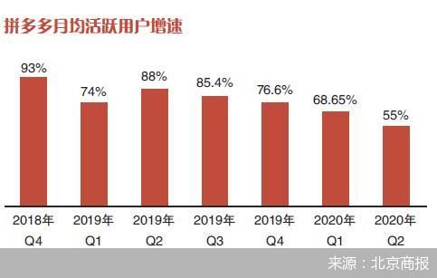 从拼多多公布的2020年第二季度财报中不难看出,尽管2020年第二季度拼多多月均活跃用户数净增8140万,实现了单季净增规模新高,但从同比增速来看,拼多多月均活跃用户同比增速的劲头的确大不如从前,已从2018年四季度同比增长93%到现如今的55%。用户量增长似乎在逼近天花板。