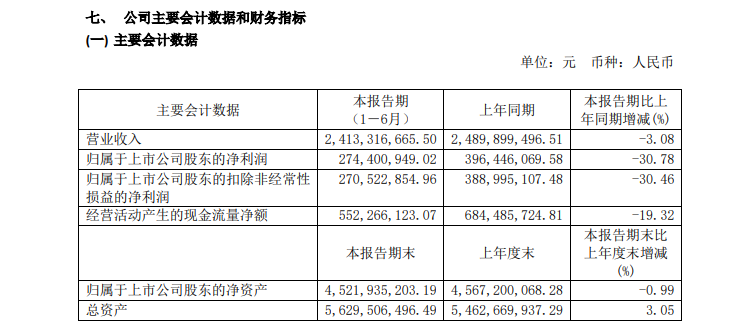 绝味食品公布2020年半年报。报告期内,实现营业收入24.1亿元,同比下降3.08%;净利润2.74亿元,同比下降30.78%。