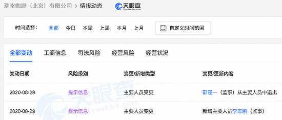 8月31日消息,据天眼查App显示,8月29日,瑞幸咖啡(北京)有限公司发生主要人员变更,郭谨一卸任公司监事,李志鹏接任。