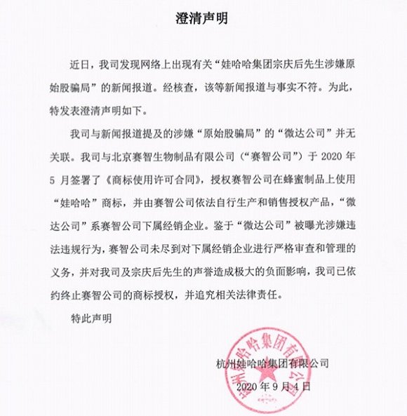 娃哈哈在上述声明中表示,它跟北京赛智生物制品有限公司(以下简称“赛智公司”)于2020年5月签署了《商标使用许可合同》,授权后者在蜂蜜制品上使用“娃哈哈”商标,并由赛智公司依法自行生产和销售授权产品,而微达公司系赛智公司下属经销企业。鉴于赛智公司未尽到对下属经销企业进行严格审查和管理的义务,并对娃哈哈和宗庆后的声誉造成极大的负面影响,公司已依约终止赛智公司的商标授权,并追究相关法律责任。