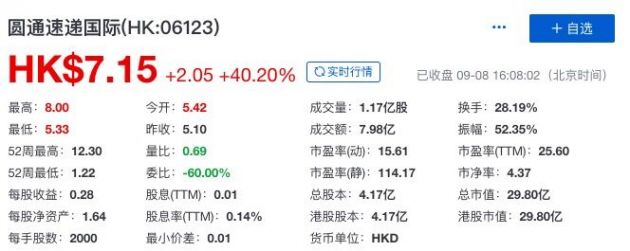 受阿里增持圆通12%股份消息影响,港股圆通速递国际今天开盘后继续大涨。截至港股收盘,圆通速递国际股价报7.15港元,涨幅为40.2%。