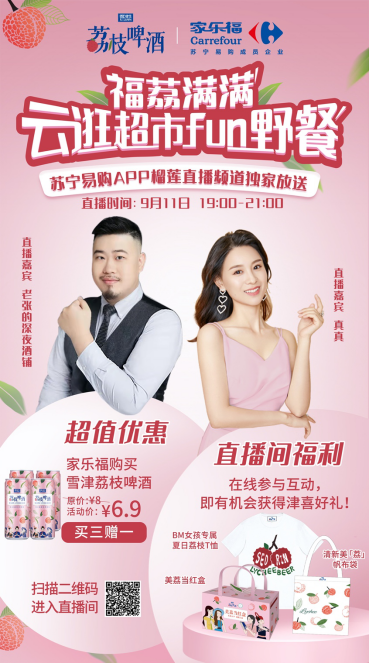 据悉,9月11日直播当天,两位人气酒类主播“老张的深夜酒铺”、主持人真真将空降上海家乐福古北店,带你一站式逛买野餐必备,现场解析超好上手的荔枝啤酒花式喝法。