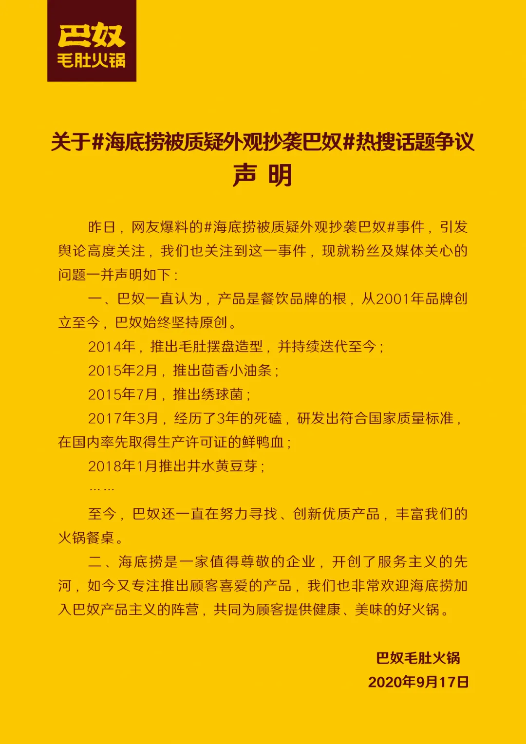 9月17日晚间,针对海底捞被质疑外观抄袭巴奴一事,巴奴毛肚火锅在其官方微信公众号发布声明称,海底捞是一家值得尊敬的企业,开创了服务主义的先河,如今又专注推出顾客喜爱的产品,非常欢迎海底捞加入巴奴产品主义的阵营。