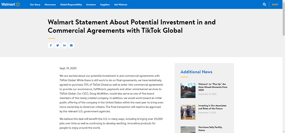 沃尔玛在官网发布声明,暂时同意购买TikTok Global的7.5%股份,并达成商业协议以向TikTok Global提供电商及其他全渠道服务。TikTok Global将由包括甲骨文和沃尔玛在内的美国投资者多数控股,沃尔玛首席执行官道格·麦克米伦(Doug McMillon)将担任新公司的五名董事会成员之一。