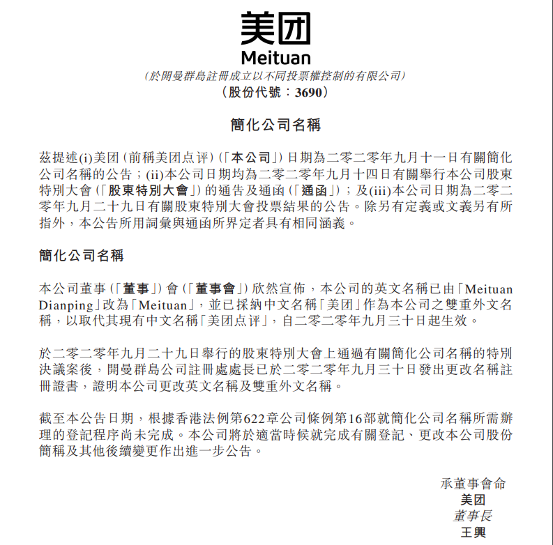 10月9日消息,美团点评公告,公司的英文名称已由Meituan Dianping改为Meituan,并已采纳中文名称美团作为公司双重外文名称,以取代其现有中文名称美团点评,自2020年9月30日起生效。...