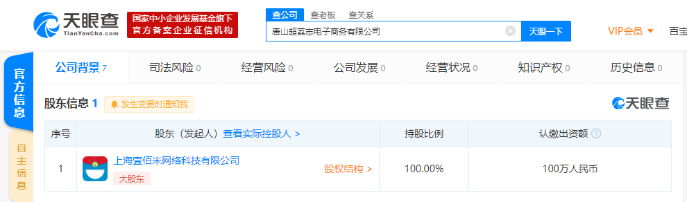 天眼查App显示,10月20日,唐山超荔志电子商务有限公司成立。该公司法定代表人为俞乐,注册资本100万人民币,公司经营范围包括互联网批发、零售;日用品、通讯设备等;家用电器维修;文化艺术交流策划;家政服务;计算机软硬件开发;电脑图文设计等。天眼查App股东信息显示,该公司由叮咚买菜关联公司上海壹佰米网络科技有限公司100%控股。