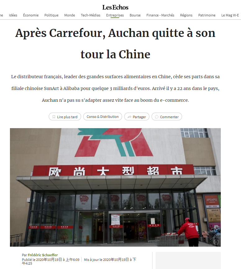 10月19日,法国超市集团欧尚宣布决定离开中国,将它的子公司和其拥有的484家商店(欧尚和大润发)卖给阿里巴巴,卖价为30亿欧元。欧尚集团通过此次出售,寻求减少债务,并打算在新国家发展零售业务。