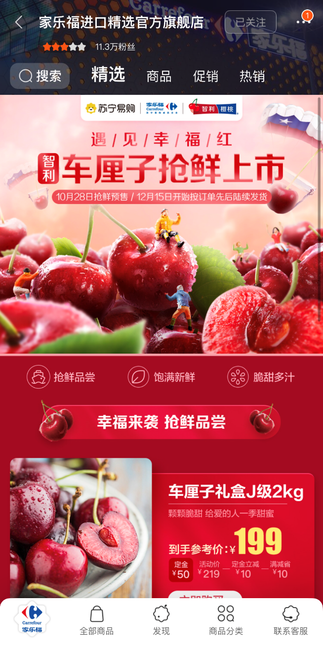适逢中国双十一前夕,当全民燃起购物热情之时,在南美洲西南部的智利果园,果树的枝头已悄然染上一抹绯色。 10月28日上午10时,智利车厘子抢鲜上市,第一时间在苏宁家乐福开启预售。这也宣告着本年度车厘子季的正式开...
