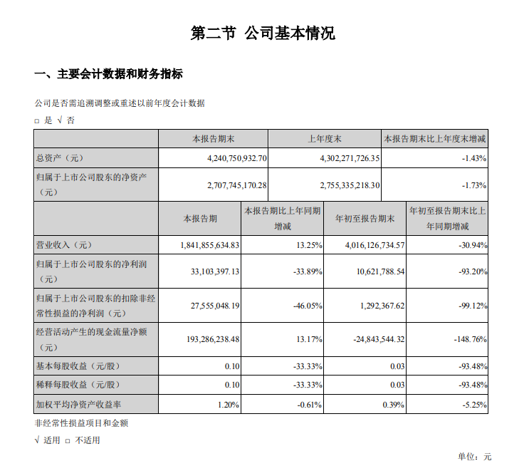 龙商网消息: 10月31日,广百股份公布2020财年第3季度财报。财报数据显示,报告期内广百股份营收达18.42亿元,较去年同期的16.26亿元上涨13.25%;净利润达3310.34万元,相比去年同期的5006.96万元下降33.89%。本报告期末,经营活动产生的现金流量为1.93亿元...