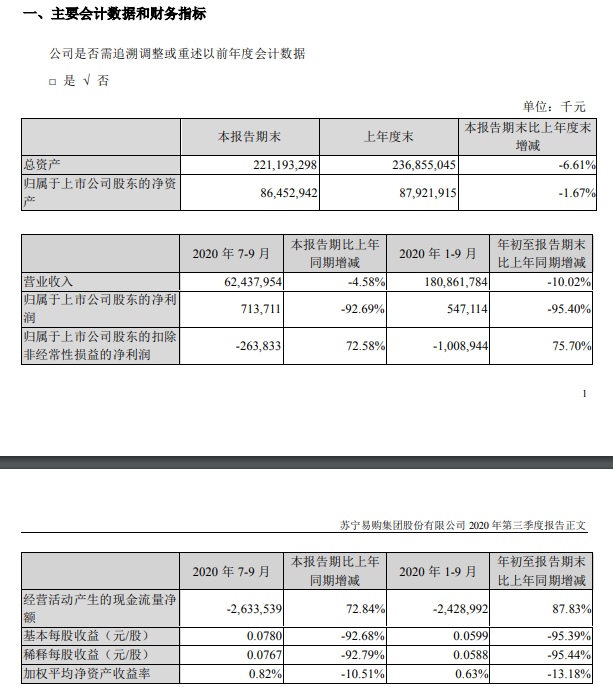 龙商网消息:10月30日晚,苏宁易购发布2020年第三季度财务报告。财报显示,第三季度苏宁易购实现归母净利润7.14亿元。1-9月,公司实现线上商品交易规模2025.52亿元,同比增长18.15%,占比达到69%。平台中非电器品类商户占比提升至89.46%。开放平台商品交易规模同比增长56.83%,1-9月苏宁易购零售云实现销售规模同比增长77.5%。此外,零售云业务保持快速增长,1-9月苏宁易购零售云实现销售规模同比增长77.5%,新开2432家店。