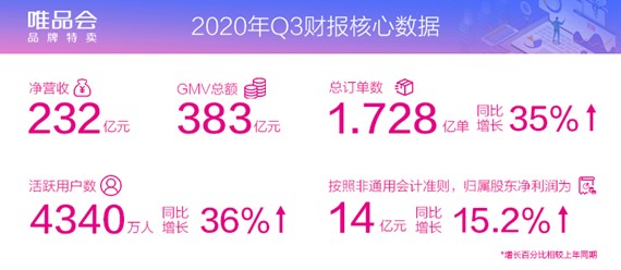 根据三季报,唯品会第三季度净营收达232亿元人民币(约合34亿美元),同比增长18.2%;按照非通用会计准则,归属股东净利润为14亿元人民币(约合2.041亿美元),同比增长15.2%;按照通用会计准则,归属股东净利润为12亿元人民币(约合1.833亿美元),同比增长42.1%。至此,唯品会已保持32个季度连续盈利。