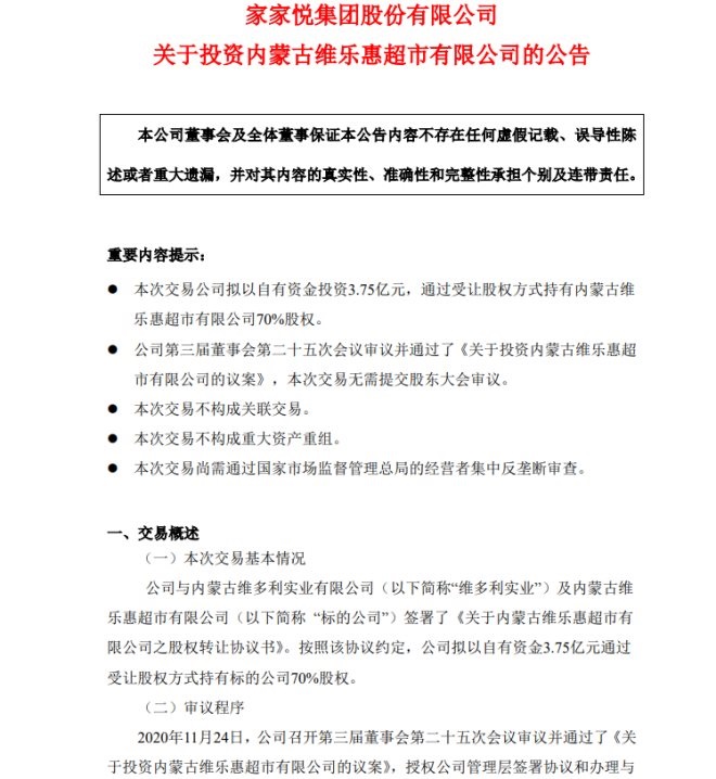 龙商网消息: 11月24日晚,家家悦披露公告,公司与内蒙古维多利实业有限公司及内蒙古维乐惠超市有限公司(以下简称标的公司)签署了股权转让协议书,按照协议约定,公司拟以自有资金3.75亿元通过受让股权方式持有标的公司70%股权。 据了解,标的公司主要从事超...