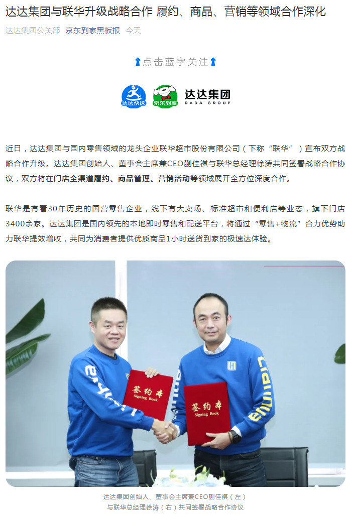近日,达达集团与联华超市股份有限公司宣布双方战略合作升级。双方将在门店全渠道履约、商品管理、营销活动等领域展开全方位深度合作。达达集团将通过“零售+物流”优势帮助联华提效增收,为消费者提供商品1小时送货到家。