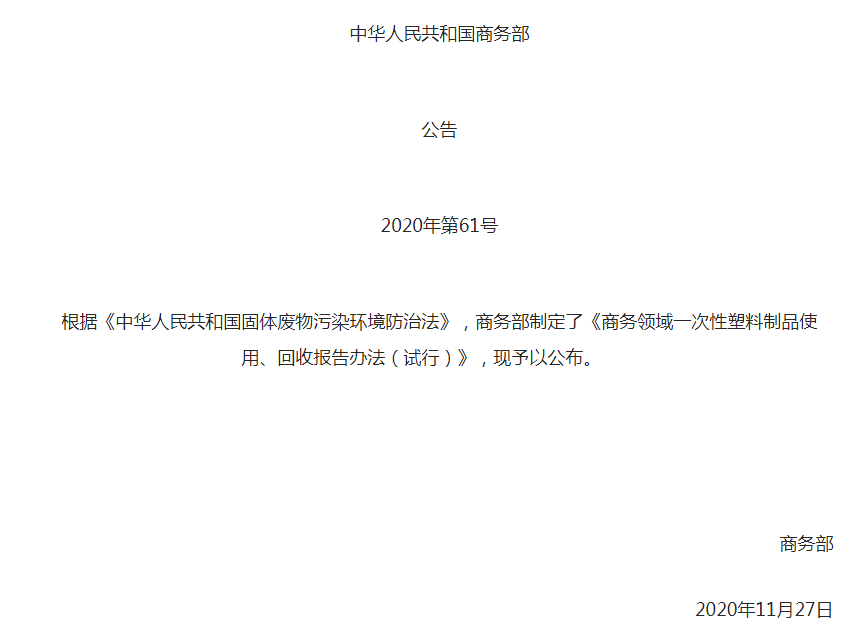 11月30日,商务部制定了《商务领域一次性塑料制品使用、回收报告办法(试行)》,办法指出,国家鼓励和引导减少使用、积极回收塑料袋等一次性塑料制品,推广应用可循环、易回收、可降解的替代产品。商品零售场所开办单位、电子商务平台企业、外卖企业使用塑料袋等一次性塑料制品的,应根据本办法向商务主管部门报告使用、回收情况。