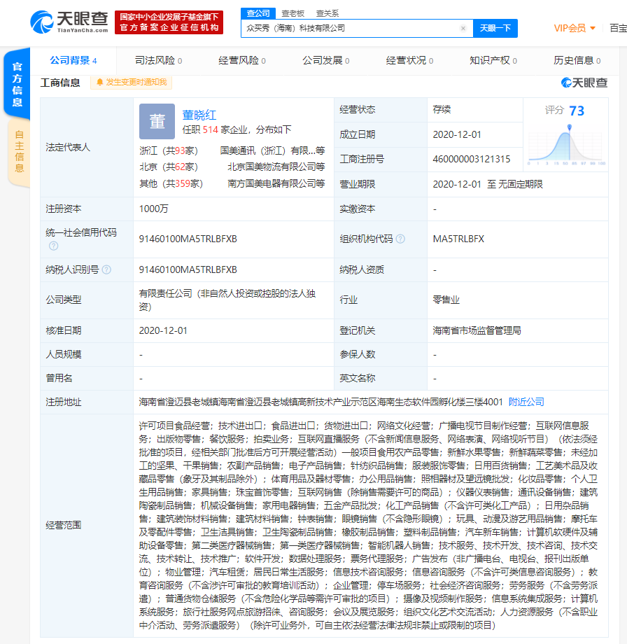 天眼查App显示,近日,众买秀(海南)科技有限公司成立,法定代表人为董晓红,注册资本1000万,经营范围包含食用农产品零售、新鲜水果零售、新鲜蔬菜零售、电子产品销售、服装服饰零售、日用百货销售等。国美控股集团有限公司持有该公司100%股权。