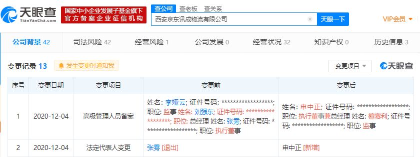 天眼查App显示,近日,西安京东讯成物流有限公司发生工商变更,张雱退出法定代表人,由申中正接任,同时,刘强东退出总经理,张雱退出执行董事,李娅云退出监事,新增申中正为执行董事兼总经理,檀赛利为监事。西安京东讯成物流有限公司成立于2017年6月,注...