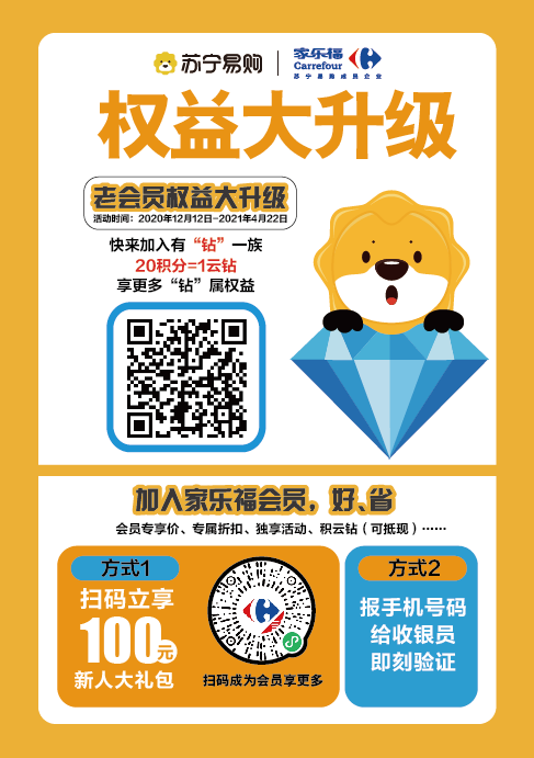 原有的会员积分有效期进入倒计时,不知道怎么用?12月12日起,苏宁家乐福年终权益大回馈,举办会员积分换云钻活动,为广大会员延长积分有效期、升级应用场景。这一次,家乐福带你变身有“钻”一族,替你叫醒账户中沉睡已久的积分!